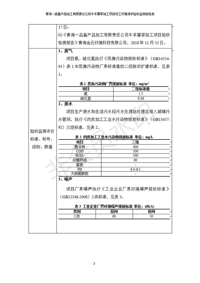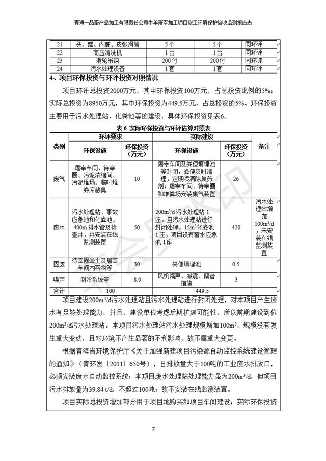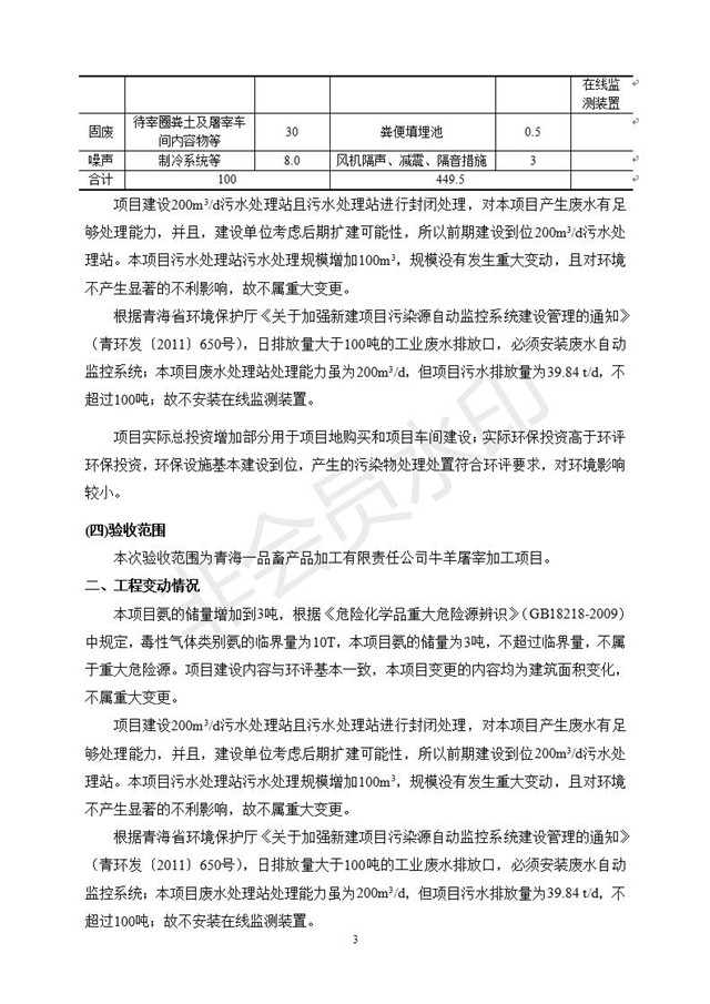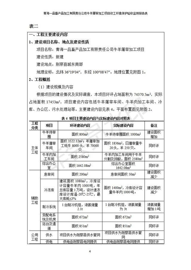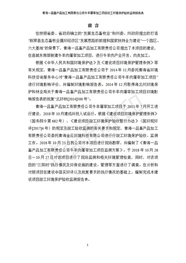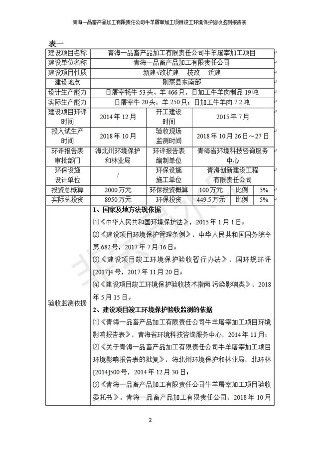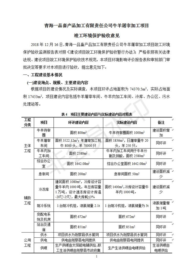 根據(jù)中華人民共和國國務(wù)院令第682號《國務(wù)院關(guān)于修改〈建設(shè)項目環(huán)境保護(hù)管理條例〉的決定》和《建設(shè)項目竣工環(huán)境保護(hù)驗收暫行辦法》(國務(wù)院令682號),青海一品畜產(chǎn)品加工有限責(zé)任公司牛羊屠宰加工項目(包括竣工環(huán)境保護(hù)驗收監(jiān)測報告表和驗收意見)公示如下。 一、項目名稱:青海一品畜產(chǎn)品加工有限責(zé)任公司牛羊屠宰加工項目竣工環(huán)境保護(hù)驗收監(jiān)測報告表 二、地點:剛察縣縣城東大街加油站東側(cè) 三、建設(shè)單位:青海一品畜產(chǎn)品加工有限責(zé)任公司 四、建設(shè)內(nèi)容:項目地面積17453m2,項目建設(shè)內(nèi)容包括牛羊屠宰車間、牛羊肉加工車間、冷庫、辦公區(qū)、污水處理站等。 五、聯(lián)系人:張工 七、公示時間:二〇一九年一月十一日至二〇一九年二月七日 公示期間,對上述公示內(nèi)容如有異議,請以書面形式反饋,個人須署真實姓名,單位須加蓋公章。