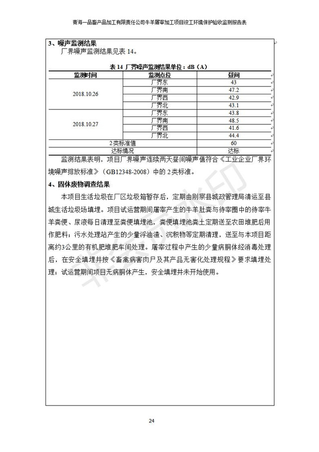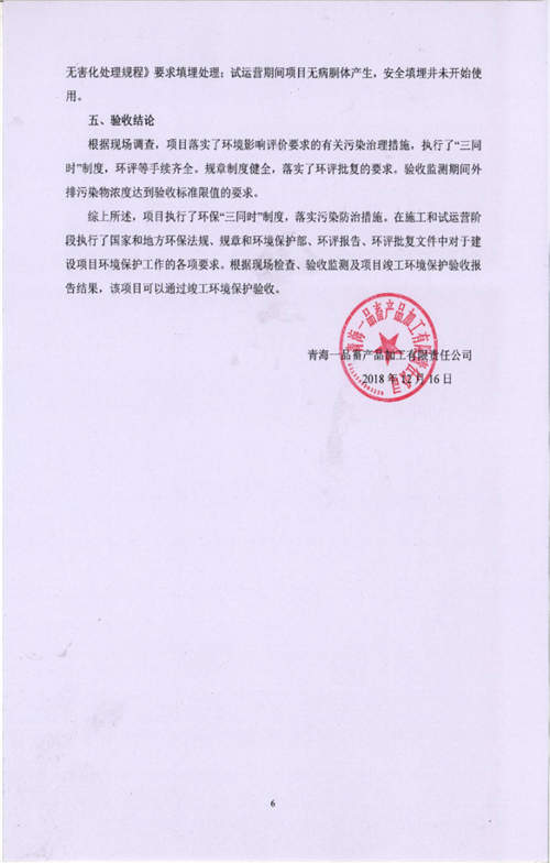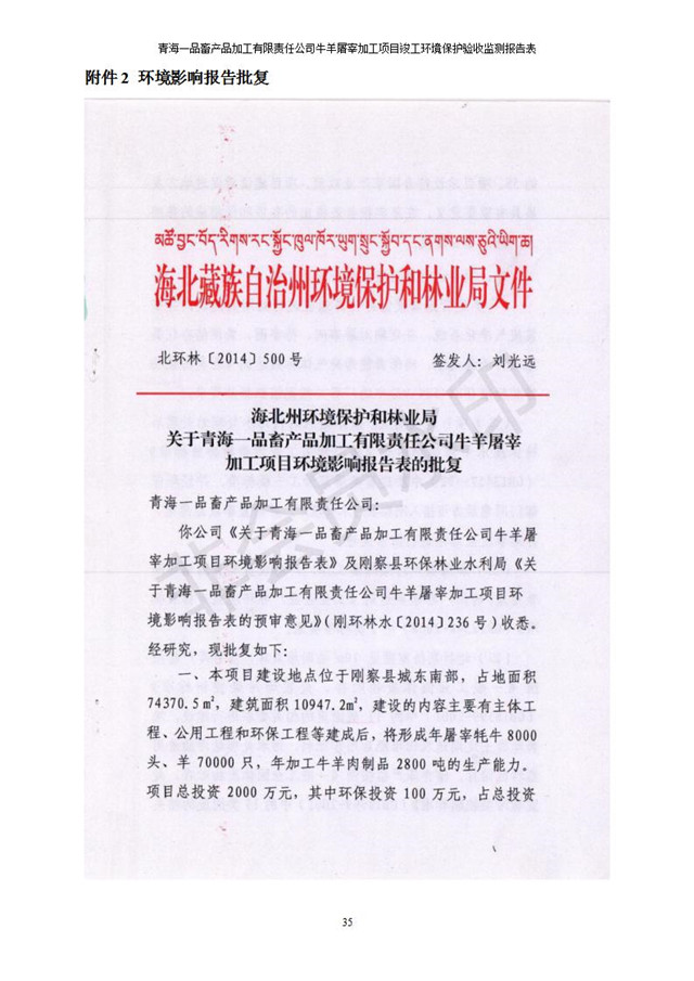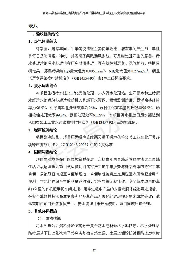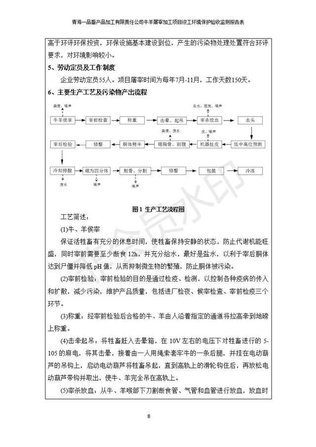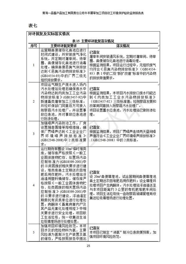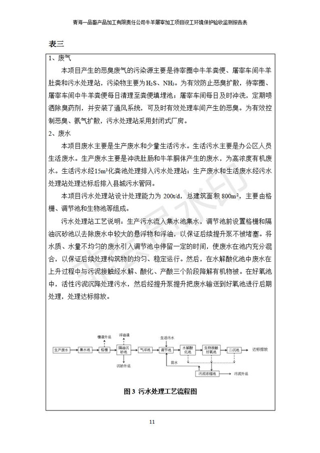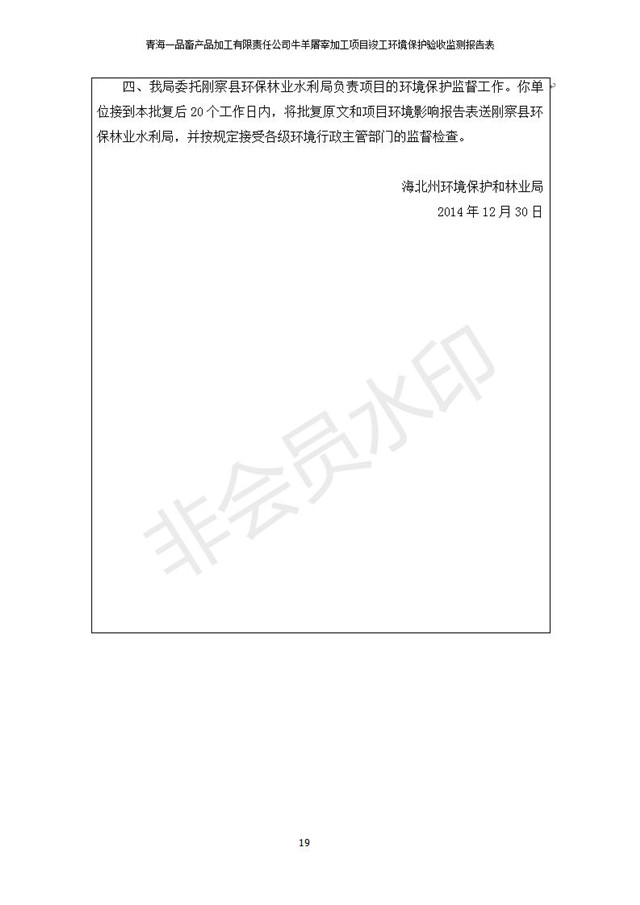 根據(jù)中華人民共和國國務(wù)院令第682號《國務(wù)院關(guān)于修改〈建設(shè)項目環(huán)境保護(hù)管理條例〉的決定》和《建設(shè)項目竣工環(huán)境保護(hù)驗收暫行辦法》(國務(wù)院令682號),青海一品畜產(chǎn)品加工有限責(zé)任公司牛羊屠宰加工項目(包括竣工環(huán)境保護(hù)驗收監(jiān)測報告表和驗收意見)公示如下。 一、項目名稱:青海一品畜產(chǎn)品加工有限責(zé)任公司牛羊屠宰加工項目竣工環(huán)境保護(hù)驗收監(jiān)測報告表 二、地點:剛察縣縣城東大街加油站東側(cè) 三、建設(shè)單位:青海一品畜產(chǎn)品加工有限責(zé)任公司 四、建設(shè)內(nèi)容:項目地面積17453m2,項目建設(shè)內(nèi)容包括牛羊屠宰車間、牛羊肉加工車間、冷庫、辦公區(qū)、污水處理站等。 五、聯(lián)系人:張工 七、公示時間:二〇一九年一月十一日至二〇一九年二月七日 公示期間,對上述公示內(nèi)容如有異議,請以書面形式反饋,個人須署真實姓名,單位須加蓋公章。