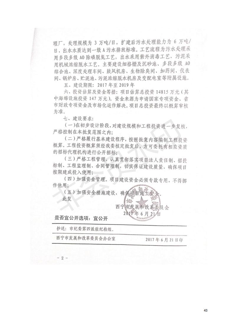 根據(jù)中華人民共和國國務(wù)院令第682號《國務(wù)院關(guān)于修改〈建設(shè)項目環(huán)境保護(hù)管理條例〉的決定》和《建設(shè)項目竣工環(huán)境保護(hù)驗收暫行辦法》(國務(wù)院令682號),西寧市第四污水處理廠擴(kuò)建工程建設(shè)項目(包括竣工環(huán)境保護(hù)驗收監(jiān)測報告表和驗收意見)公示如下。 一、項目名稱:西寧市第四污水處理廠擴(kuò)建工程建設(shè)項目 二、地點:五四西路南側(cè),原西寧市第四污水處理廠西側(cè)用地 三、建設(shè)單位:西寧市排水開發(fā)建設(shè)有限公司 四、建設(shè)內(nèi)容:第四污水處理廠擴(kuò)建工程五、聯(lián)系人:張工 六、聯(lián)系電 話:0971-6515411 七、公示時間:二〇一九年九月十七日至二〇一九年十月十八日公示期間,對上述公示內(nèi)容如有異議,請以書面形式反饋,個人須署真實姓名,單位須加蓋公章。