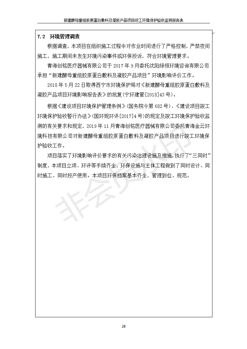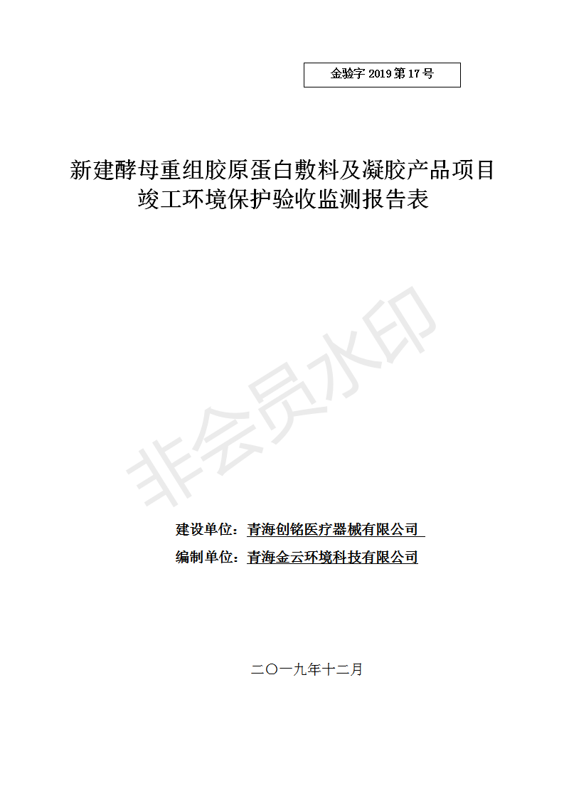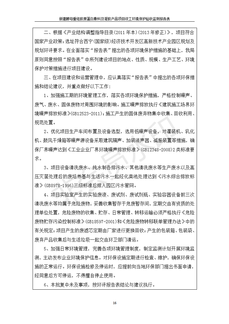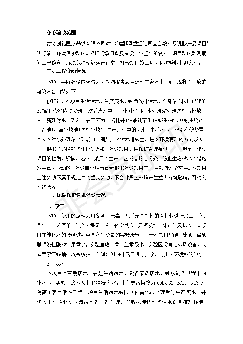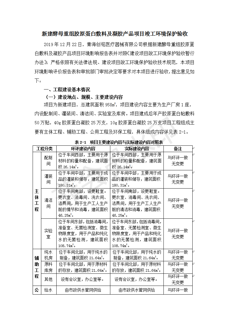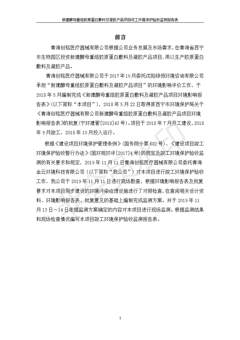 根據(jù)中華人民共和國國務院令第682號《國務院關于修改〈建設項目環(huán)境保護管理條例〉的決定》和《建設項目竣工環(huán)境保護驗收暫行辦法》(國務院令682號),新建酵母重組膠原蛋白敷料及凝膠產(chǎn)品項目(包括竣工環(huán)境保護驗收監(jiān)測報告表和驗收意見)公示如下。 一、項目名稱:新建酵母重組膠原蛋白敷料及凝膠產(chǎn)品項目 二、地點:西寧市生物園區(qū)經(jīng)四路26號15號樓2層 五、聯(lián)系人:董繼風 六、聯(lián)系電話:18606125050 七、公示時間:二〇二〇年一月十三日至二〇二〇年二月十二日 公示期間,對上述公示內容如有異議,請以書面形式反饋,個人須署真實姓名,單位須加蓋公章。