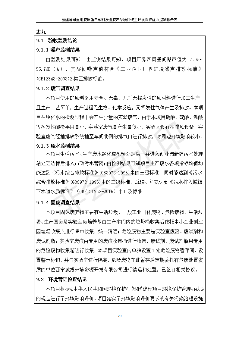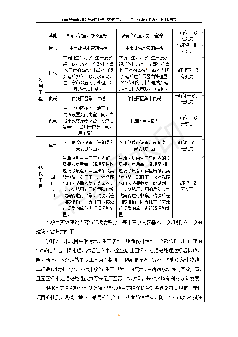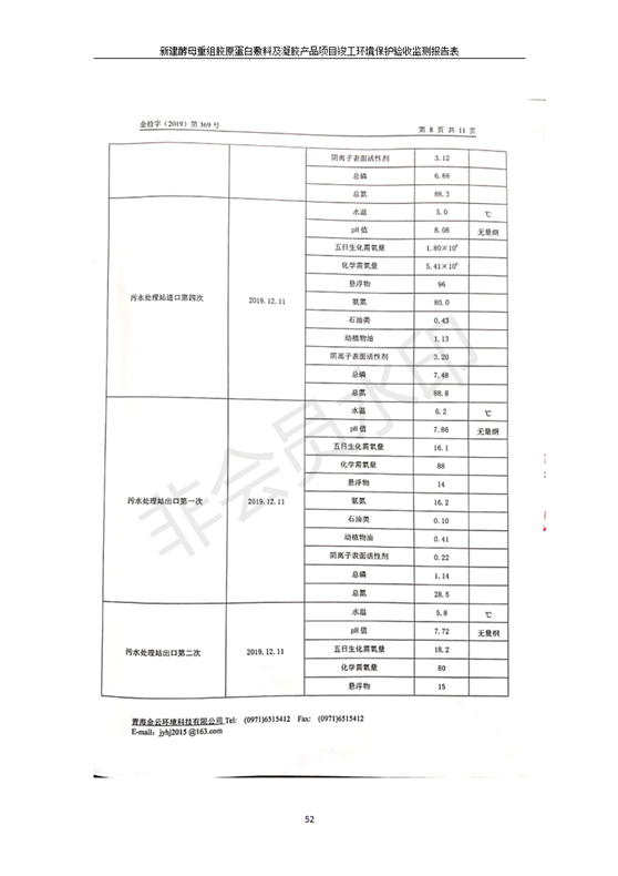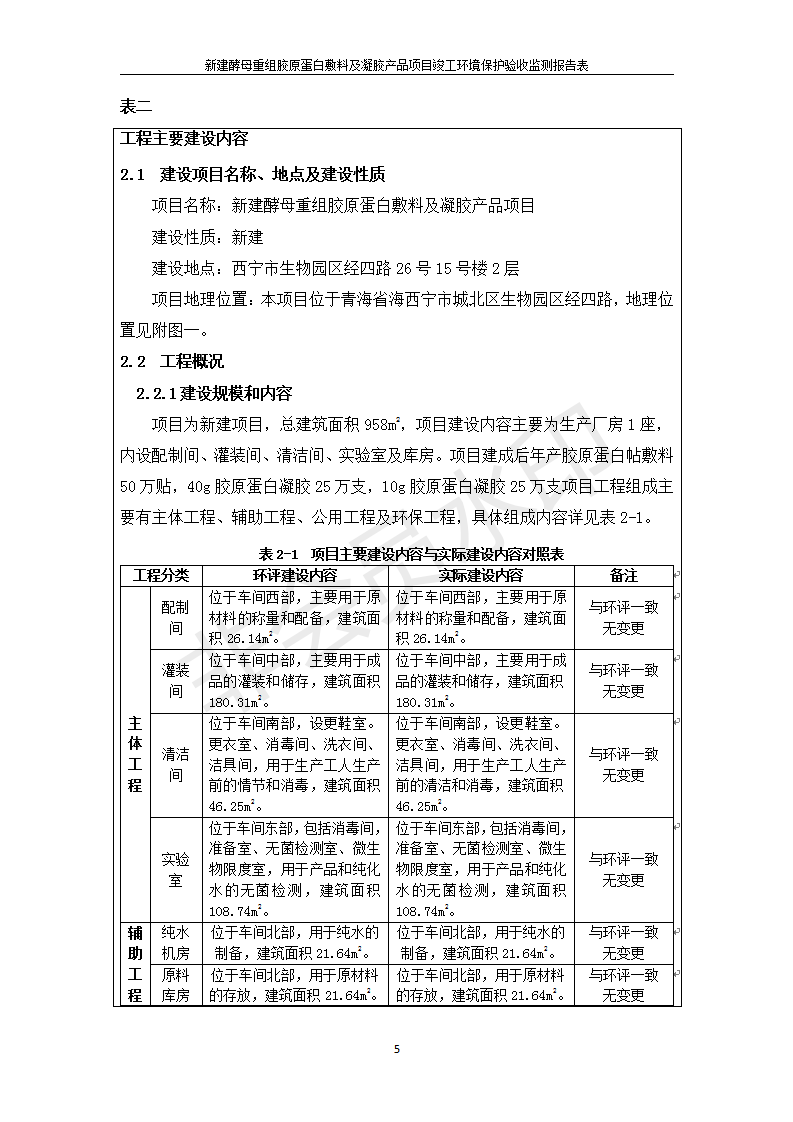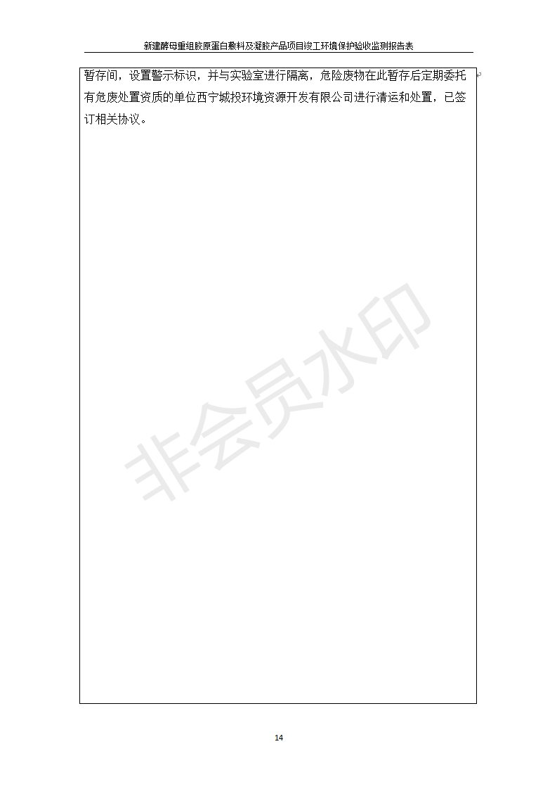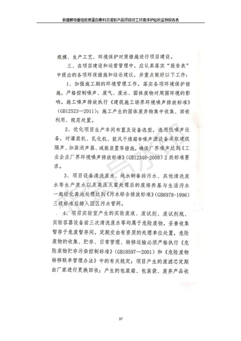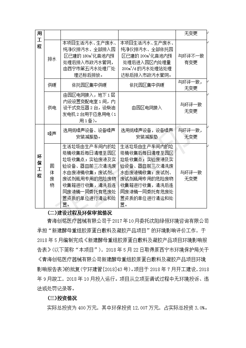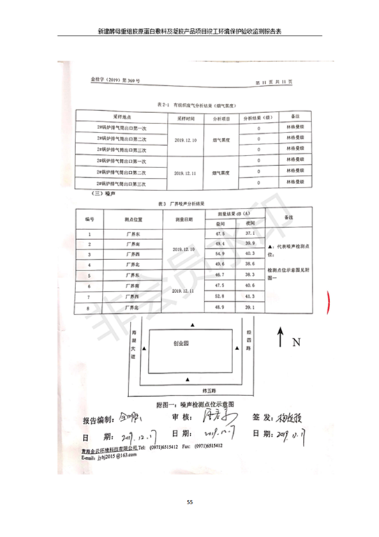 根據(jù)中華人民共和國國務院令第682號《國務院關于修改〈建設項目環(huán)境保護管理條例〉的決定》和《建設項目竣工環(huán)境保護驗收暫行辦法》(國務院令682號),新建酵母重組膠原蛋白敷料及凝膠產(chǎn)品項目(包括竣工環(huán)境保護驗收監(jiān)測報告表和驗收意見)公示如下。 一、項目名稱:新建酵母重組膠原蛋白敷料及凝膠產(chǎn)品項目 二、地點:西寧市生物園區(qū)經(jīng)四路26號15號樓2層 五、聯(lián)系人:董繼風 六、聯(lián)系電話:18606125050 七、公示時間:二〇二〇年一月十三日至二〇二〇年二月十二日 公示期間,對上述公示內容如有異議,請以書面形式反饋,個人須署真實姓名,單位須加蓋公章。