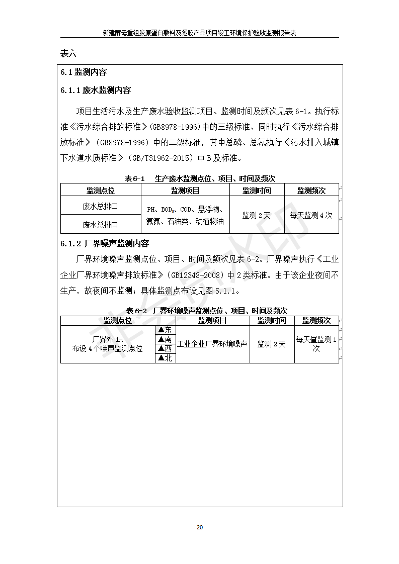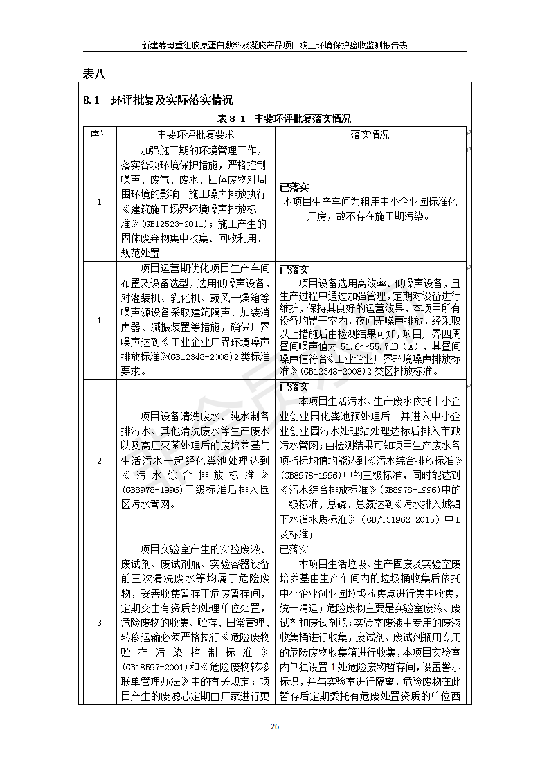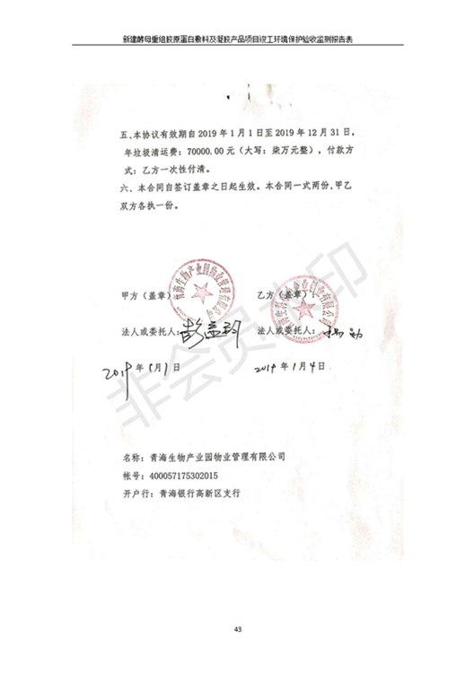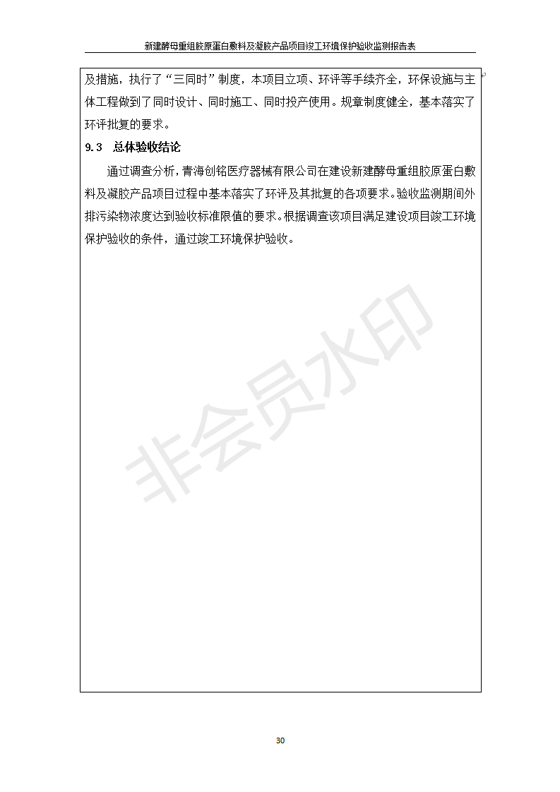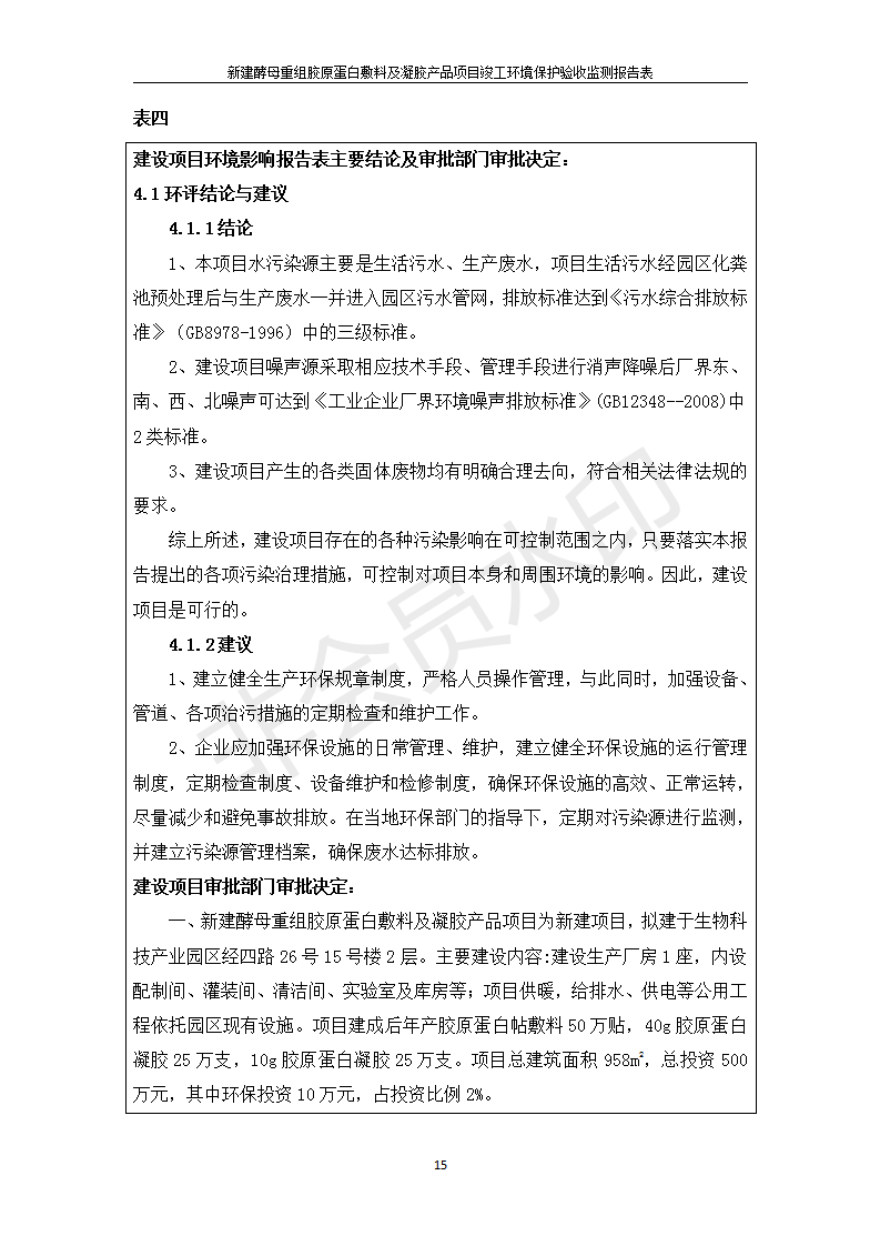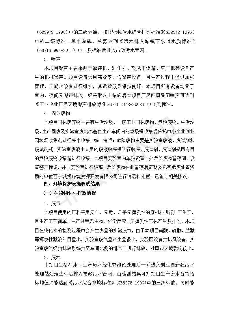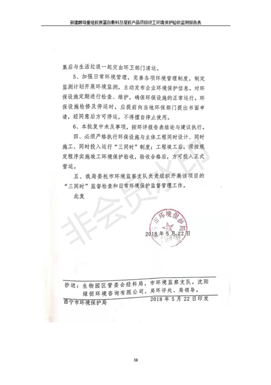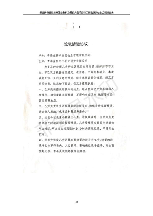 根據(jù)中華人民共和國國務院令第682號《國務院關于修改〈建設項目環(huán)境保護管理條例〉的決定》和《建設項目竣工環(huán)境保護驗收暫行辦法》(國務院令682號),新建酵母重組膠原蛋白敷料及凝膠產(chǎn)品項目(包括竣工環(huán)境保護驗收監(jiān)測報告表和驗收意見)公示如下。 一、項目名稱:新建酵母重組膠原蛋白敷料及凝膠產(chǎn)品項目 二、地點:西寧市生物園區(qū)經(jīng)四路26號15號樓2層 五、聯(lián)系人:董繼風 六、聯(lián)系電話:18606125050 七、公示時間:二〇二〇年一月十三日至二〇二〇年二月十二日 公示期間,對上述公示內容如有異議,請以書面形式反饋,個人須署真實姓名,單位須加蓋公章。