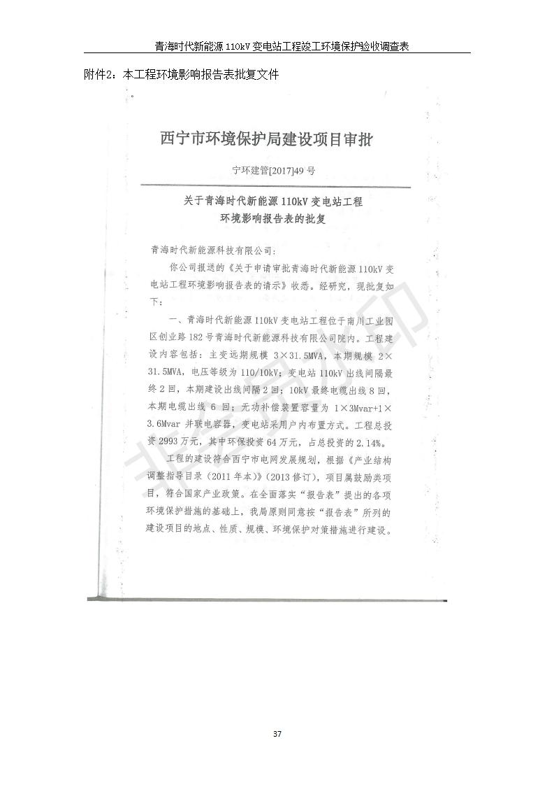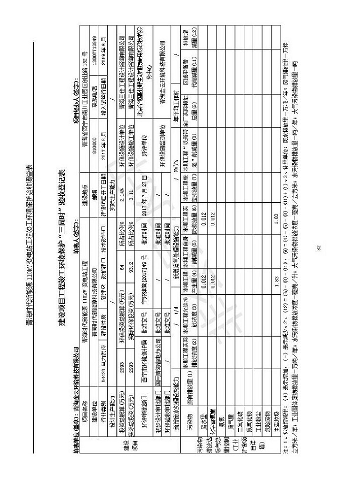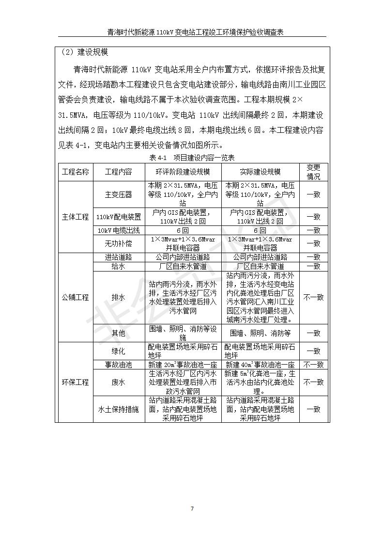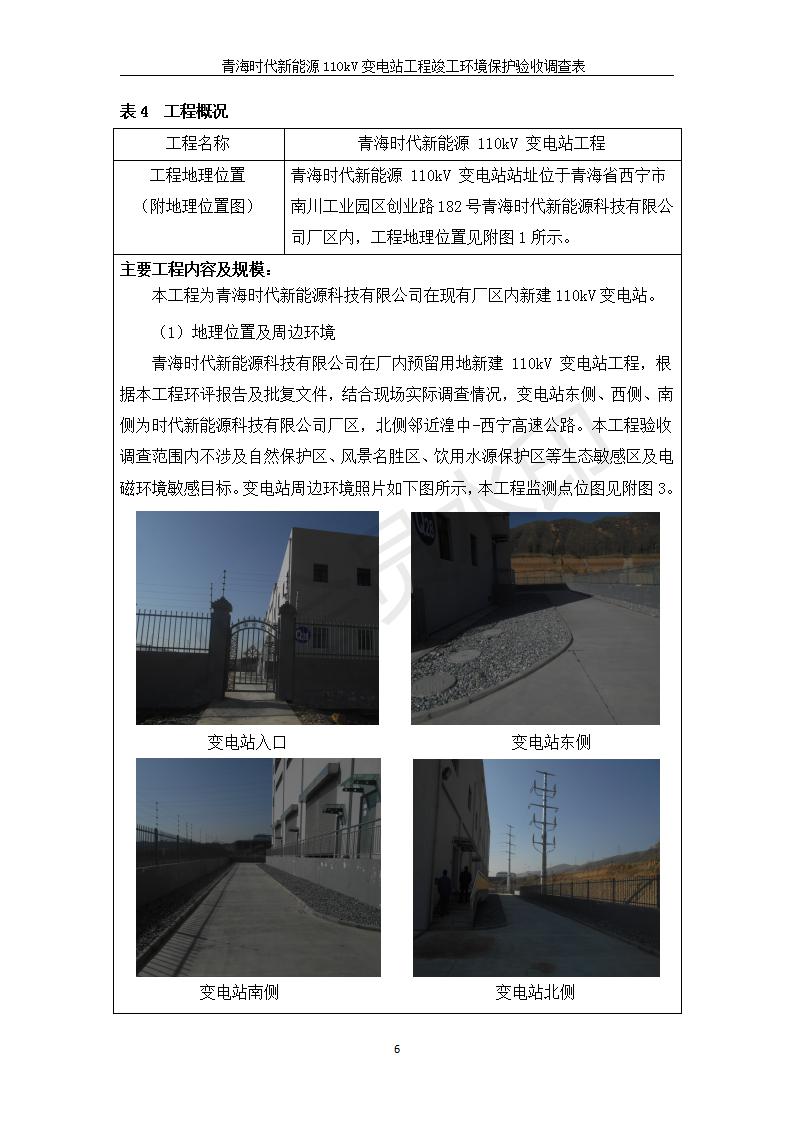 根據(jù)中華人民共和國國務院令第682號《國務院關于修改〈建設項目環(huán)境保護管理條例〉的決定》和《建設項目竣工環(huán)境保護驗收暫行辦法》(國務院令682號),青海時代新能源110kV變電站工程(包括竣工環(huán)境保護驗收調(diào)查表和驗收意見)公示如下。 一、項目名稱:青海時代新能源110kV變電站工程 二、地點:青海省西寧市南川工業(yè)園區(qū)創(chuàng)業(yè)路182號青海時代新能源科技有限公司廠區(qū)內(nèi) 三、建設單位:青海時代新能源科技有限公司 四、建設內(nèi)容:青海時代新能源 110kV 變電站采用全戶內(nèi)布置方式,依據(jù)環(huán)評報告及批復文件,經(jīng)現(xiàn)場踏勘本工程建設只包含變電站建設部分,輸電線路由南川工業(yè)園區(qū)管委會負責建設,輸電線路不屬于本次驗收調(diào)查范圍。工程本期規(guī)模2×31.5MVA,電壓等級為110/10kV。變電站 110kV 出線間隔最終2回,本期建設出線間隔2回;10kV最終電纜出線8回,本期電纜出線6回。 五、聯(lián)系人:張工 六、聯(lián)系電話:0971-6515411 七、公示時間:二〇二〇年一月十四日至二〇二〇年二月十三日 公示期間,對上述公示內(nèi)容如有異議,請以書面形式反饋,個人須署真實姓名,單位須加蓋公章。