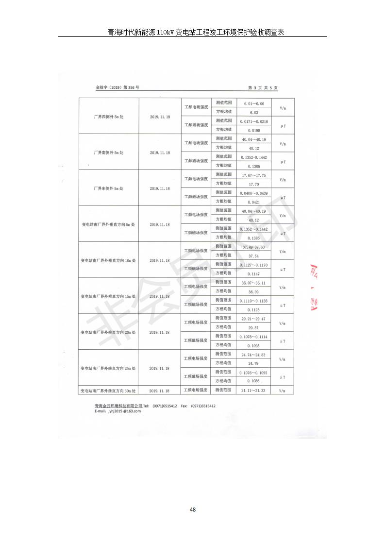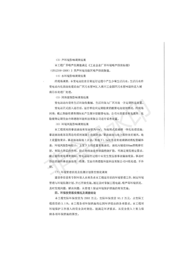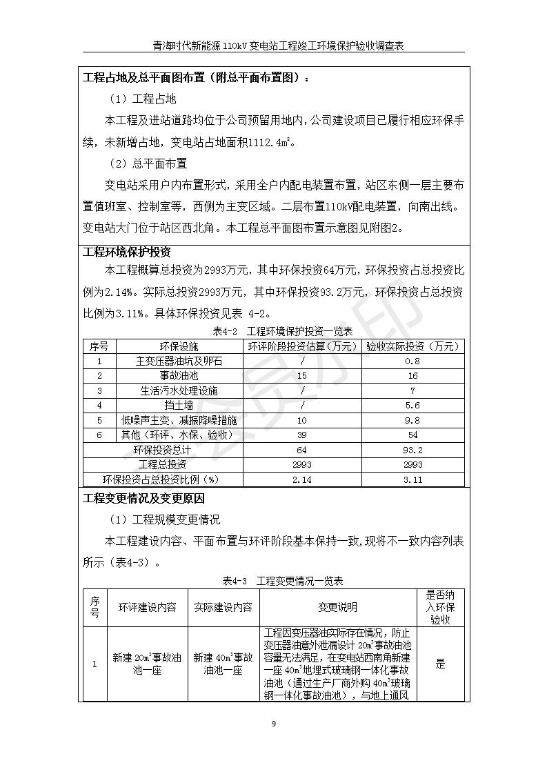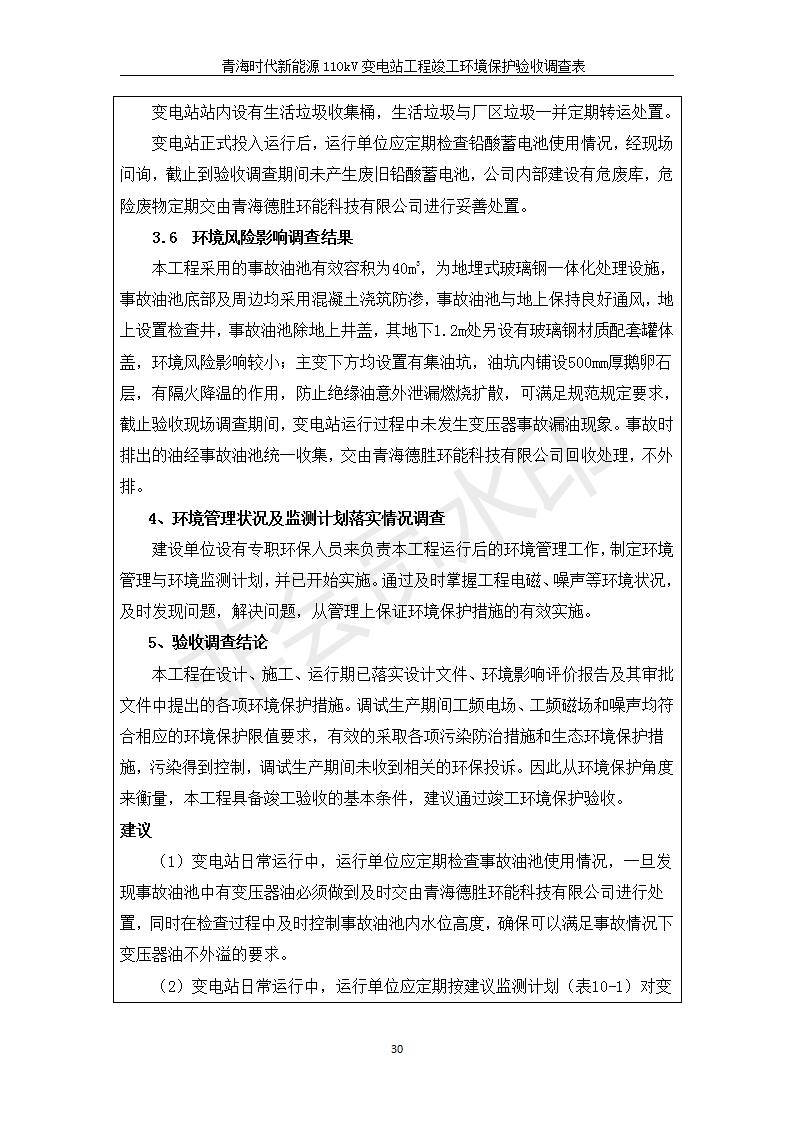 根據(jù)中華人民共和國國務院令第682號《國務院關于修改〈建設項目環(huán)境保護管理條例〉的決定》和《建設項目竣工環(huán)境保護驗收暫行辦法》(國務院令682號),青海時代新能源110kV變電站工程(包括竣工環(huán)境保護驗收調(diào)查表和驗收意見)公示如下。 一、項目名稱:青海時代新能源110kV變電站工程 二、地點:青海省西寧市南川工業(yè)園區(qū)創(chuàng)業(yè)路182號青海時代新能源科技有限公司廠區(qū)內(nèi) 三、建設單位:青海時代新能源科技有限公司 四、建設內(nèi)容:青海時代新能源 110kV 變電站采用全戶內(nèi)布置方式,依據(jù)環(huán)評報告及批復文件,經(jīng)現(xiàn)場踏勘本工程建設只包含變電站建設部分,輸電線路由南川工業(yè)園區(qū)管委會負責建設,輸電線路不屬于本次驗收調(diào)查范圍。工程本期規(guī)模2×31.5MVA,電壓等級為110/10kV。變電站 110kV 出線間隔最終2回,本期建設出線間隔2回;10kV最終電纜出線8回,本期電纜出線6回。 五、聯(lián)系人:張工 六、聯(lián)系電話:0971-6515411 七、公示時間:二〇二〇年一月十四日至二〇二〇年二月十三日 公示期間,對上述公示內(nèi)容如有異議,請以書面形式反饋,個人須署真實姓名,單位須加蓋公章。