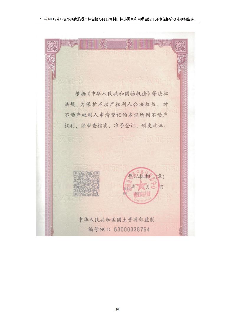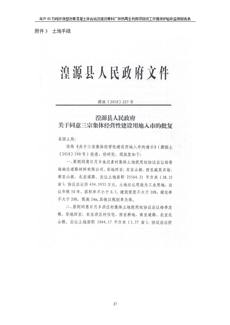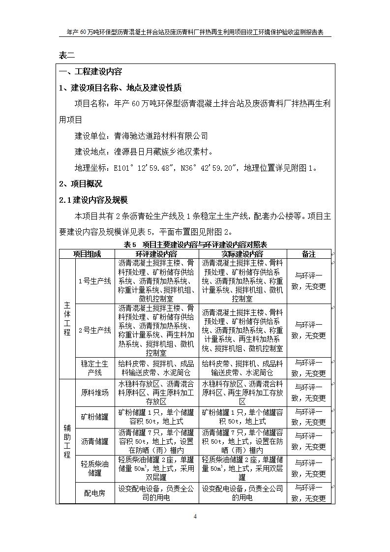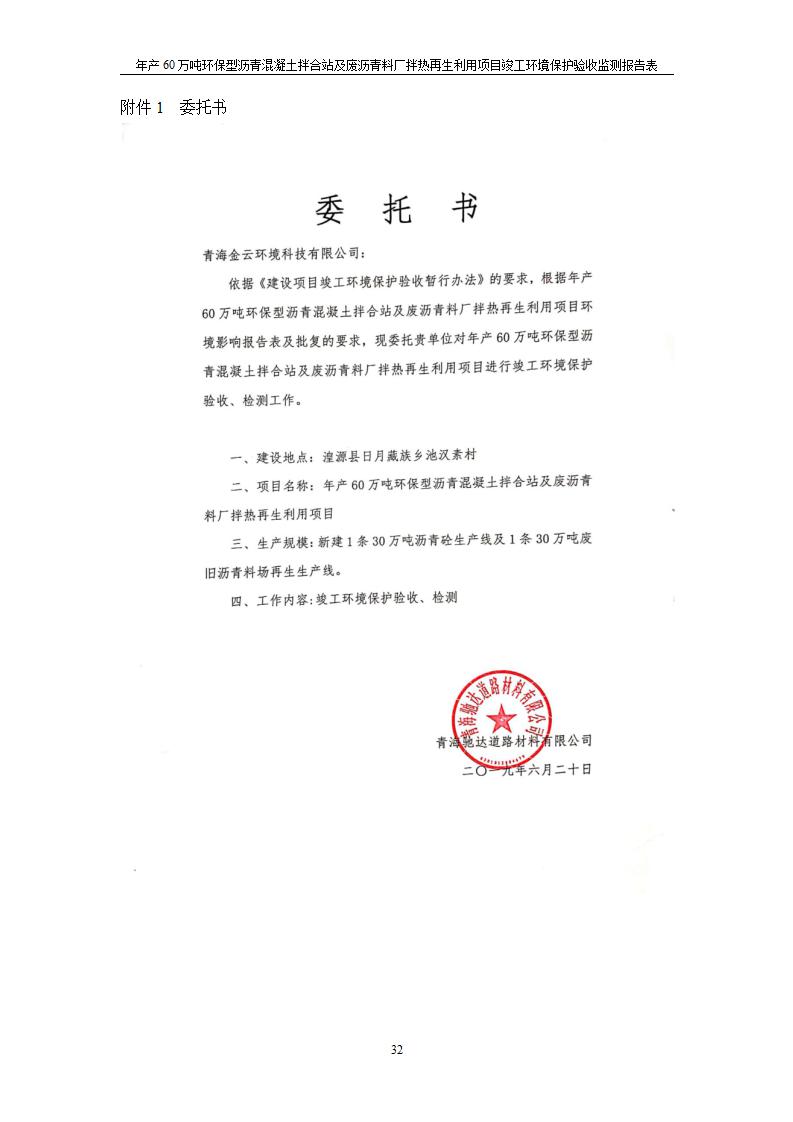 根據(jù)中華人民共和國(guó)國(guó)務(wù)院令第682號(hào)《國(guó)務(wù)院關(guān)于修改〈建設(shè)項(xiàng)目環(huán)境保護(hù)管理?xiàng)l例〉的決定》和《建設(shè)項(xiàng)目竣工環(huán)境保護(hù)驗(yàn)收暫行辦法》(國(guó)務(wù)院令682號(hào)),青海馳達(dá)道路材料有限公司年產(chǎn)60萬(wàn)噸環(huán)保型瀝青混凝土拌合站及廢瀝青料廠拌熱再生利用項(xiàng)目竣工環(huán)境保護(hù)驗(yàn)收監(jiān)測(cè)報(bào)告表公示如下。 一、項(xiàng)目名稱:年產(chǎn)60萬(wàn)噸環(huán)保型瀝青混凝土拌合站及廢瀝青料廠拌熱再生利用項(xiàng)目竣工環(huán)境保護(hù)驗(yàn)收監(jiān)測(cè)報(bào)告表 二、地點(diǎn):湟源縣日月藏族鄉(xiāng)池漢素村 三、建設(shè)單位:青海馳達(dá)道路材料有限公司 四、建設(shè)內(nèi)容:本項(xiàng)目共有2條瀝青砼生產(chǎn)線及1條穩(wěn)定土生產(chǎn)線,配套辦公樓等。 五、聯(lián)系人:楊工 六、聯(lián)系電 話:0971-6515411 七、公示時(shí)間:二〇二〇年七月六日至二〇二〇年七月三十一日 公示期間,對(duì)上述公示內(nèi)容如有異議,請(qǐng)以書(shū)面形式反饋,個(gè)人須署真實(shí)姓名,單位須加蓋公章。