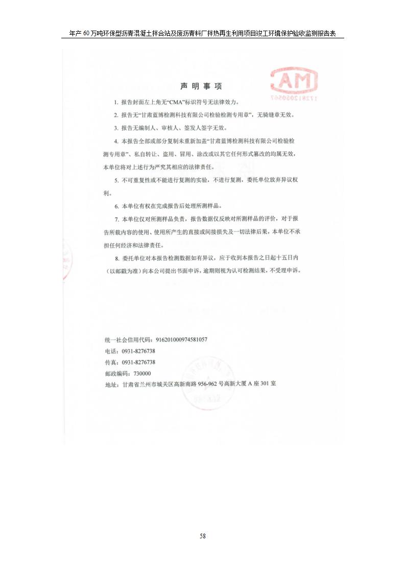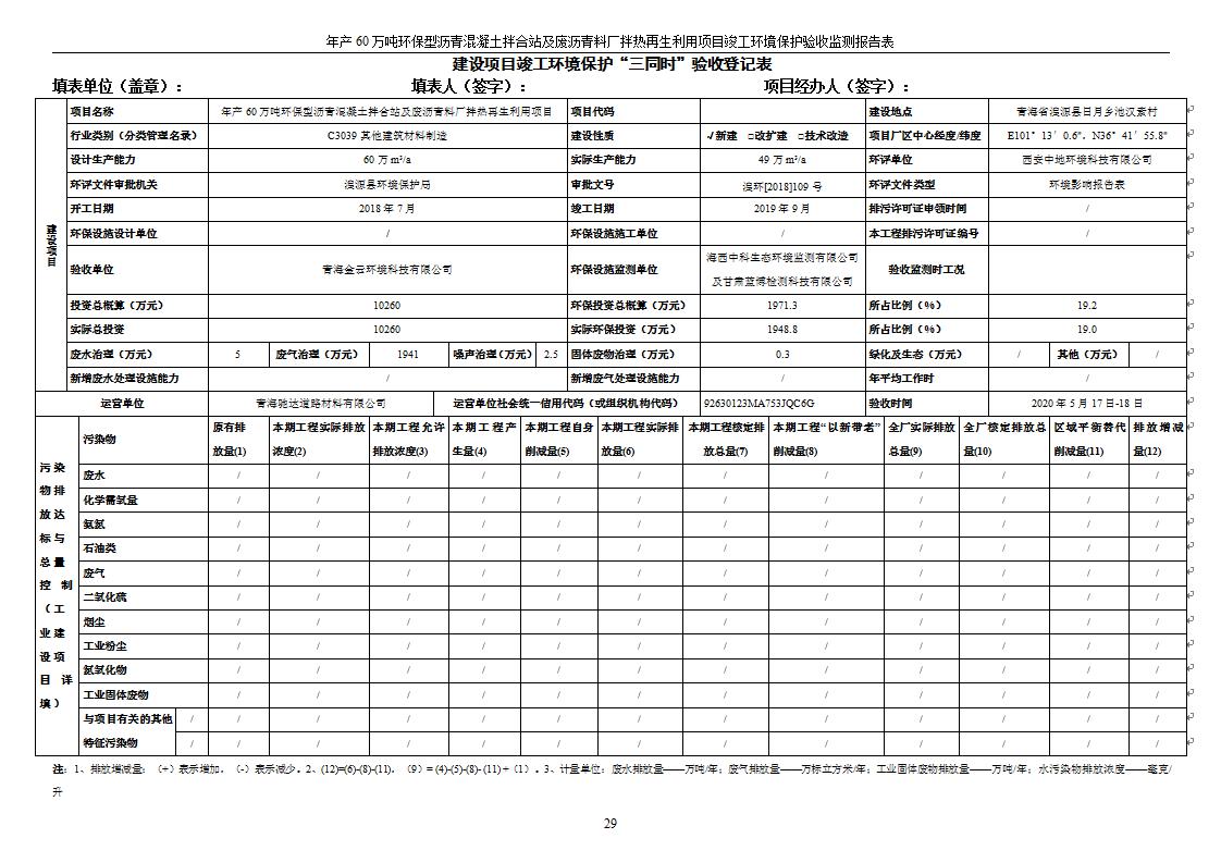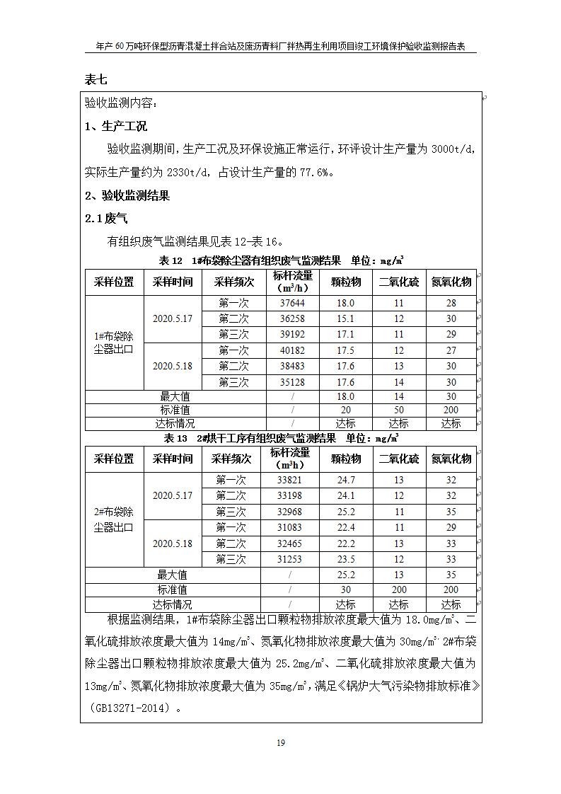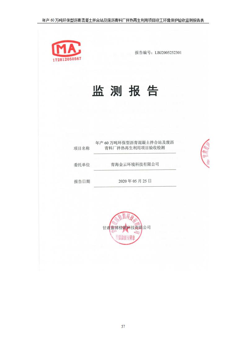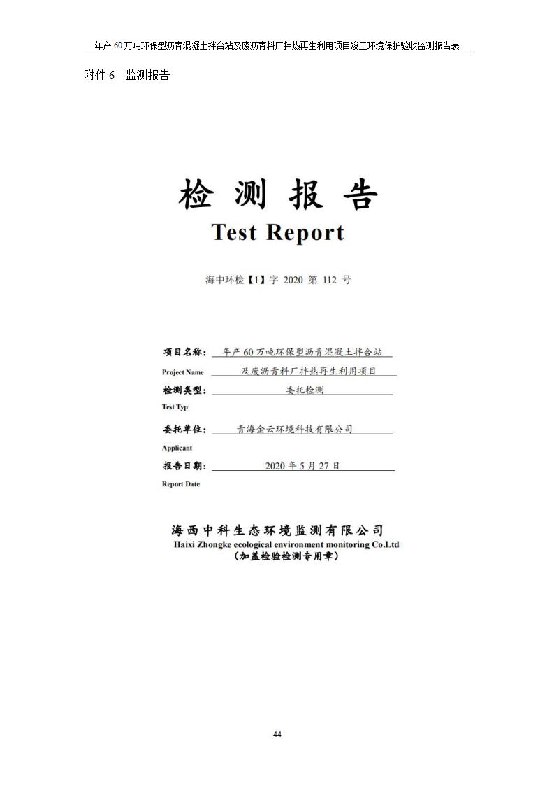 年產(chǎn)60萬(wàn)噸環(huán)保型瀝青混凝土拌合站及廢瀝青料廠拌熱再生利用項(xiàng)目竣工環(huán)境保護(hù)驗(yàn)收監(jiān)測(cè)報(bào)告表公示發(fā)布日期:(2020-7-6) 點(diǎn)擊次數(shù):3833 |